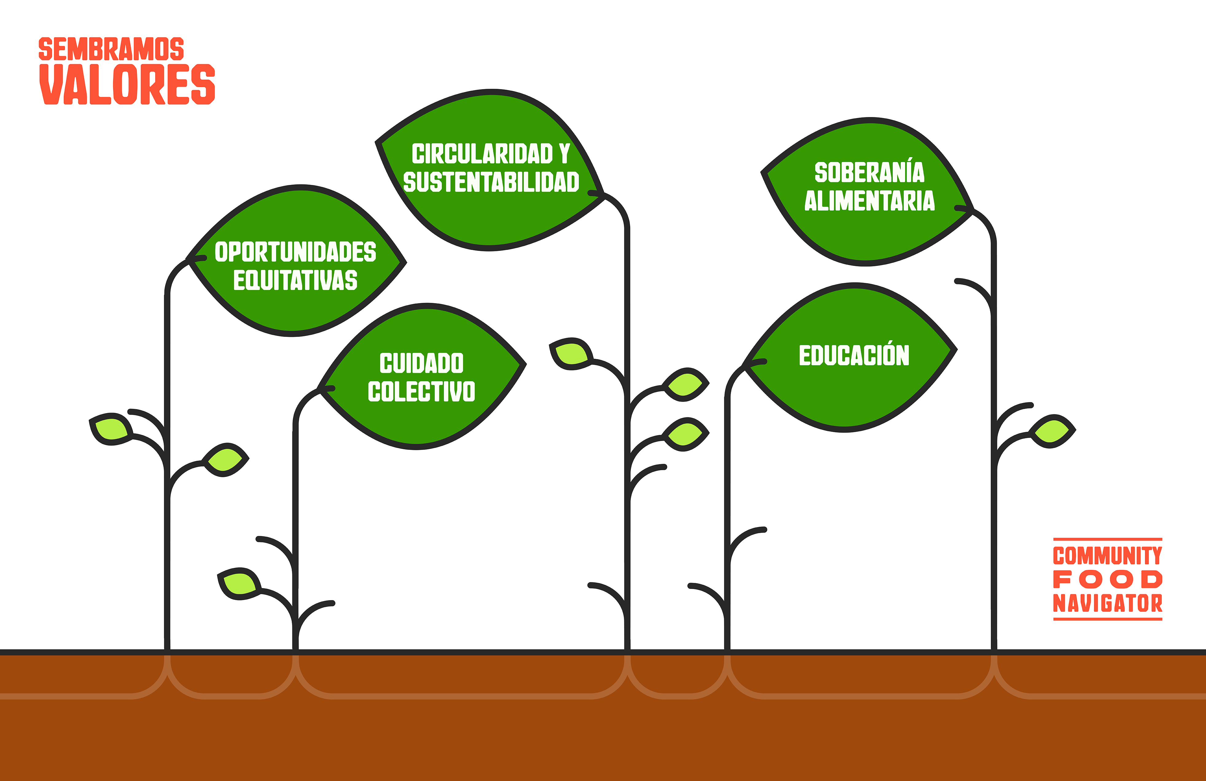 - Alfabetización alimentaria: Understanding the impact of your food choices on your health, the environment, and our economy—and understanding that these impacts are not experienced equitably. Building upon existing traditional, cultural, and indigenous knowledge. Acknowledging and addressing generational gaps in knowledge due to lack of access and prevalence of healthy food, facilities to learn how to prepare and consume food, cultural support / reinforcement to choose such foods, and early education to break negative cycles.